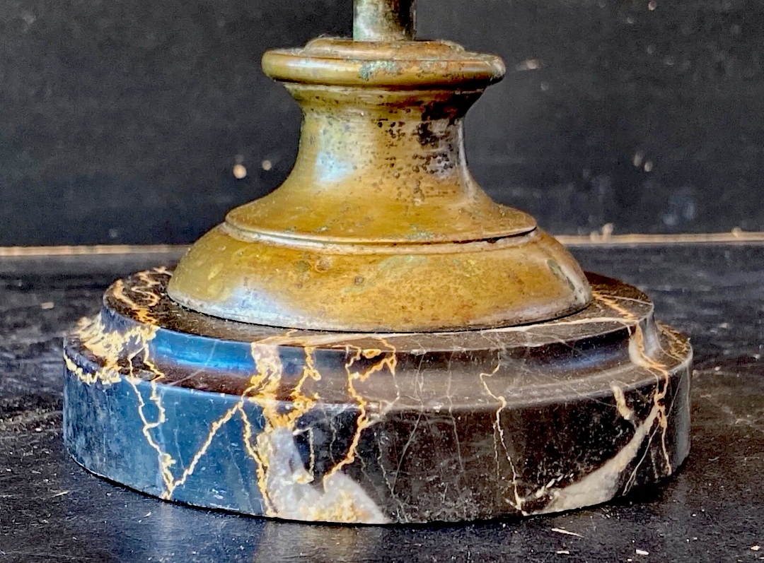 Bellissimo fascio littorio imperiale da scrivania in bronzo dorato con base in pregiato marmo “venato Portoro”, oggetto storico di grande effetto “scenico”, prodotto all’inizio degli anni ’30. Questo “simbolo di fede” così definito, fu ideato e fatto realizzare dal Regime per raccogliere i fondi necessari per a costruire il “Cimitero Monumentale del Grappa” per far si che migliaia di caduti della prima guerra mondiale potessero riposare in un sacrario a loro dedicato. Questi fasci littori qui, furono realizzati in tre colorazioni, ovvero in bronzo dorato come quello in argomento , bronzo argento e bronzo scuro. Lo “spettacolare” cimelio si presenta in eccellenti condizioni di conservazione, senza nessun danneggiamento, difetto e/o mancanza alcuna, conservato come reliquia da famiglia italiana da cui l’ho personalmente ritirato, pronto dopo oltre 80 anni, ad arredare od arricchire ancora una volta una scrivania, uno studio o un mobile. Misure: altezza fascio 215 mm; larghezza massima fascio 65 mm; diametro della base 105 mm; peso 800 grammi.