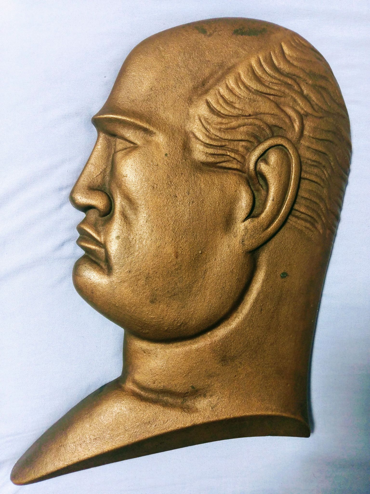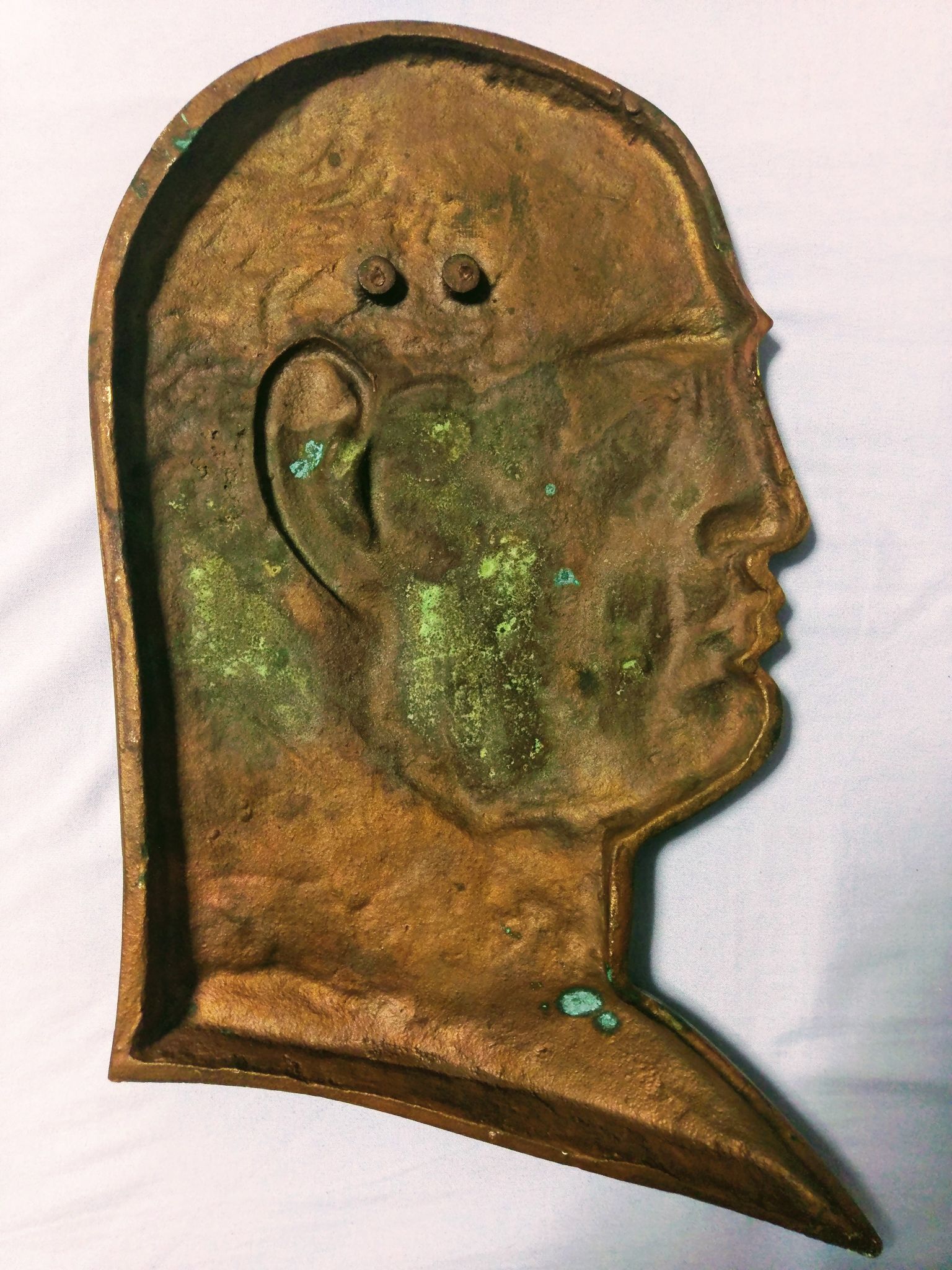 GRANDE EFFIGE IN BRONZO DEL DUCE CON ELMETTO ANNI ’30 CON DICITURA IN LATINO