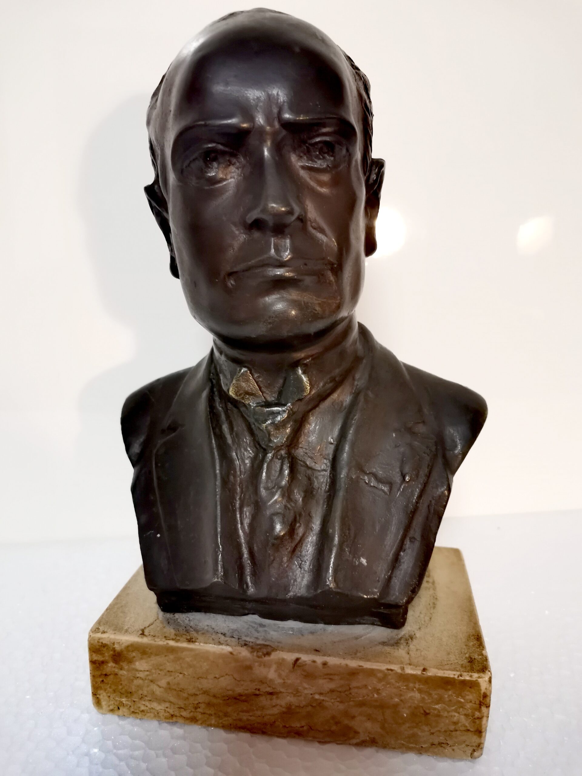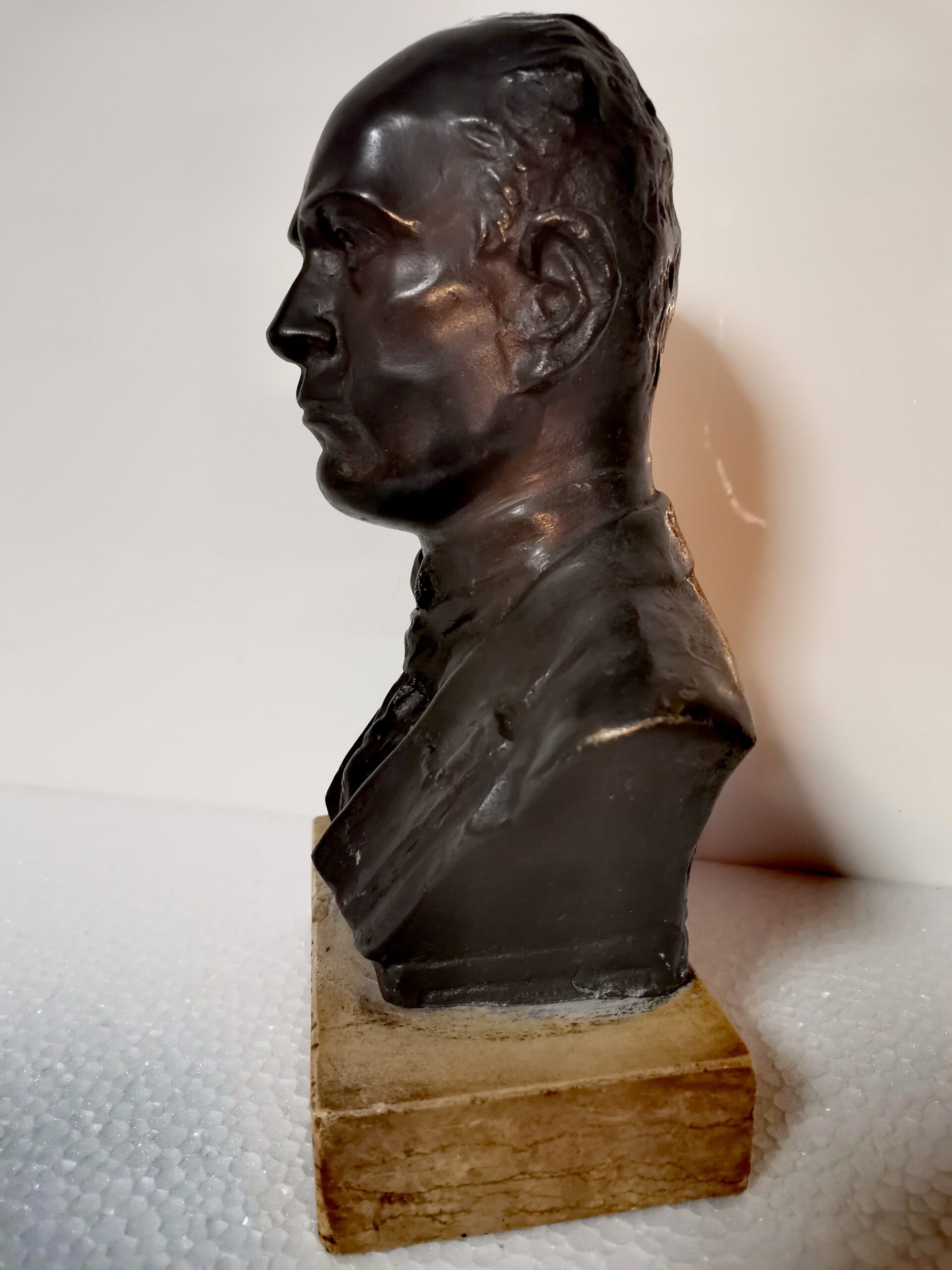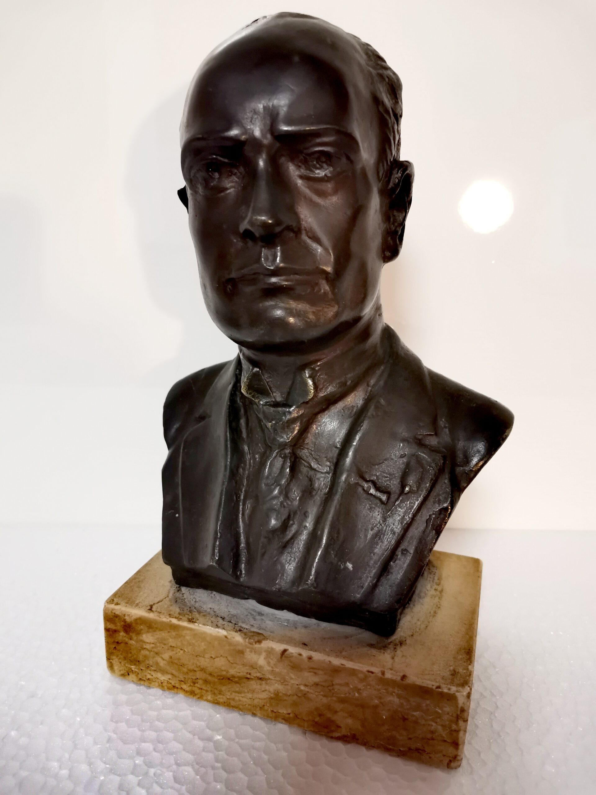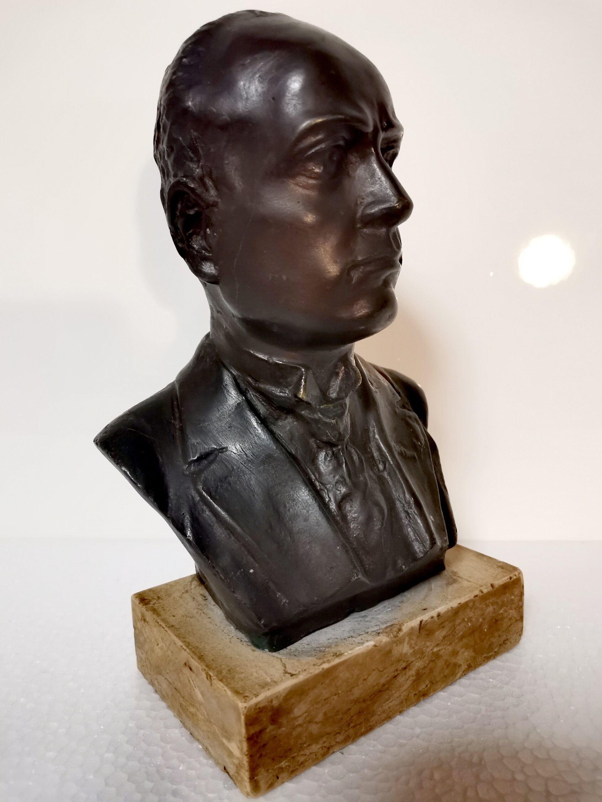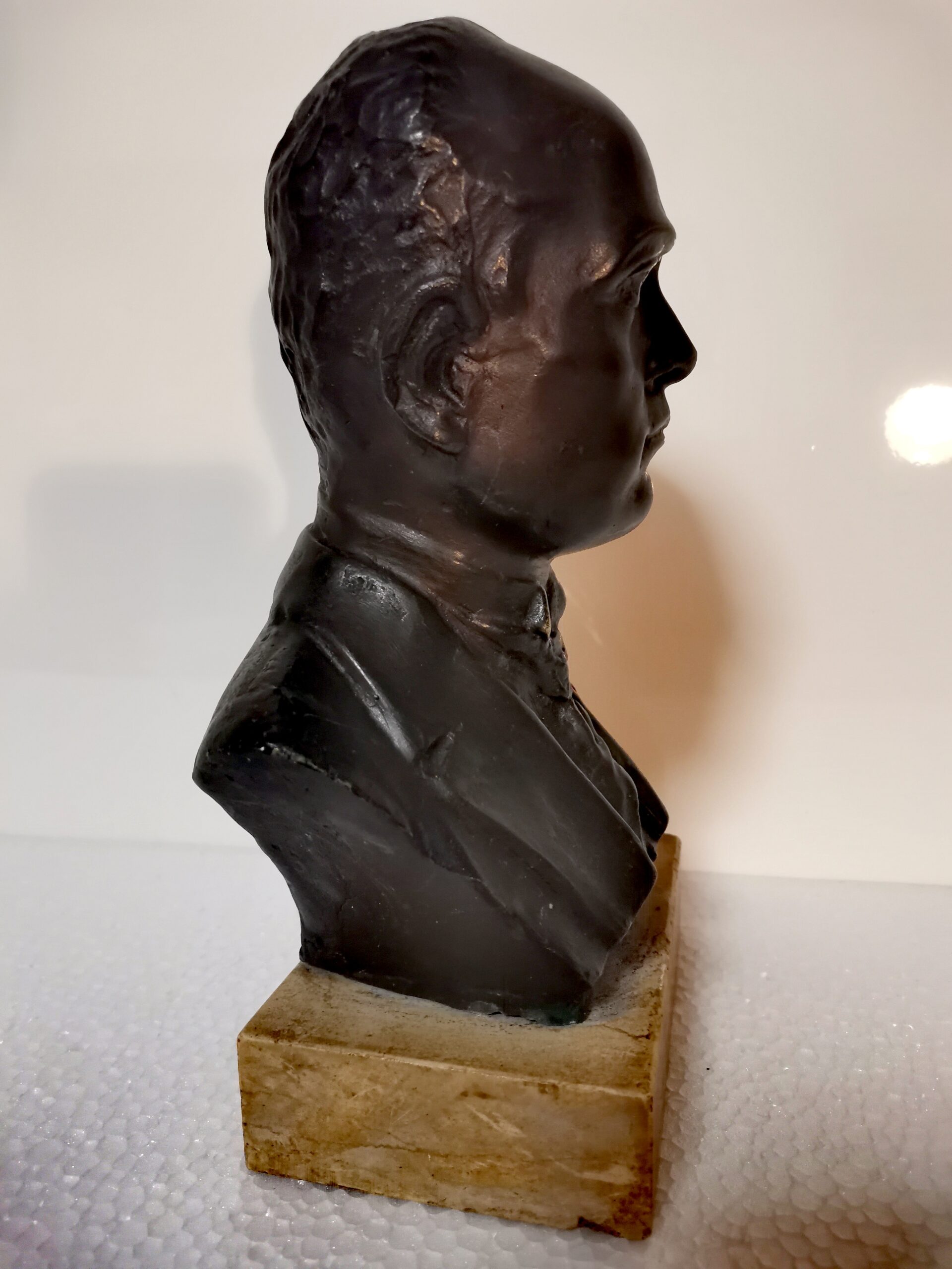 Piccolo busto in bronzo da scrivania raffigurante un giovane Duce Benito Mussolini, databile fra il 1922 e il 1928, il Duce è ancora raffiguro in abito civile come durante la marcia su Roma e sul petto porta il fascio primigenio. Altezza solo bronzo 21 cm.