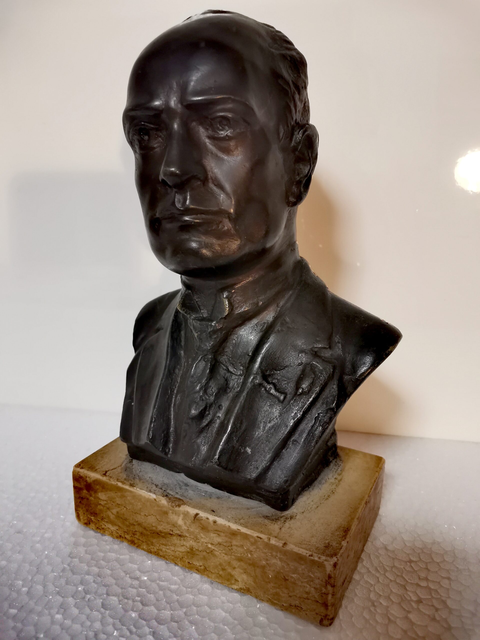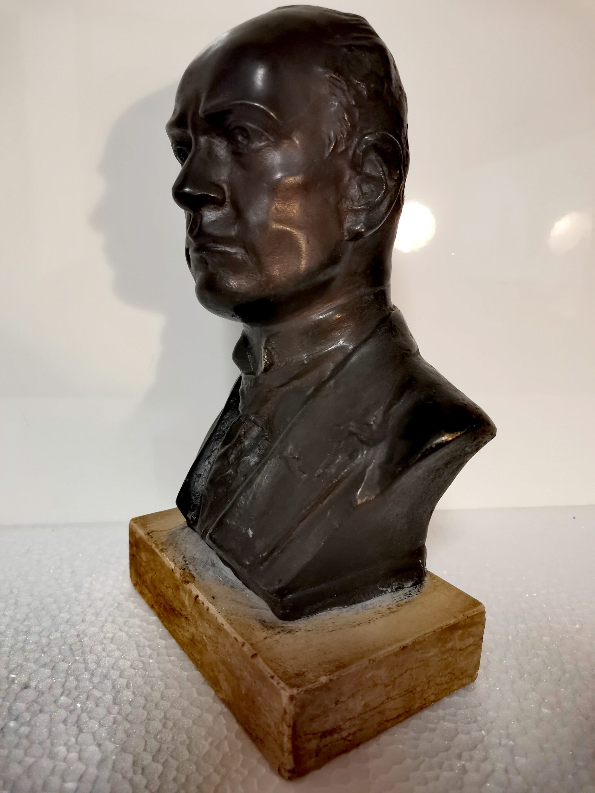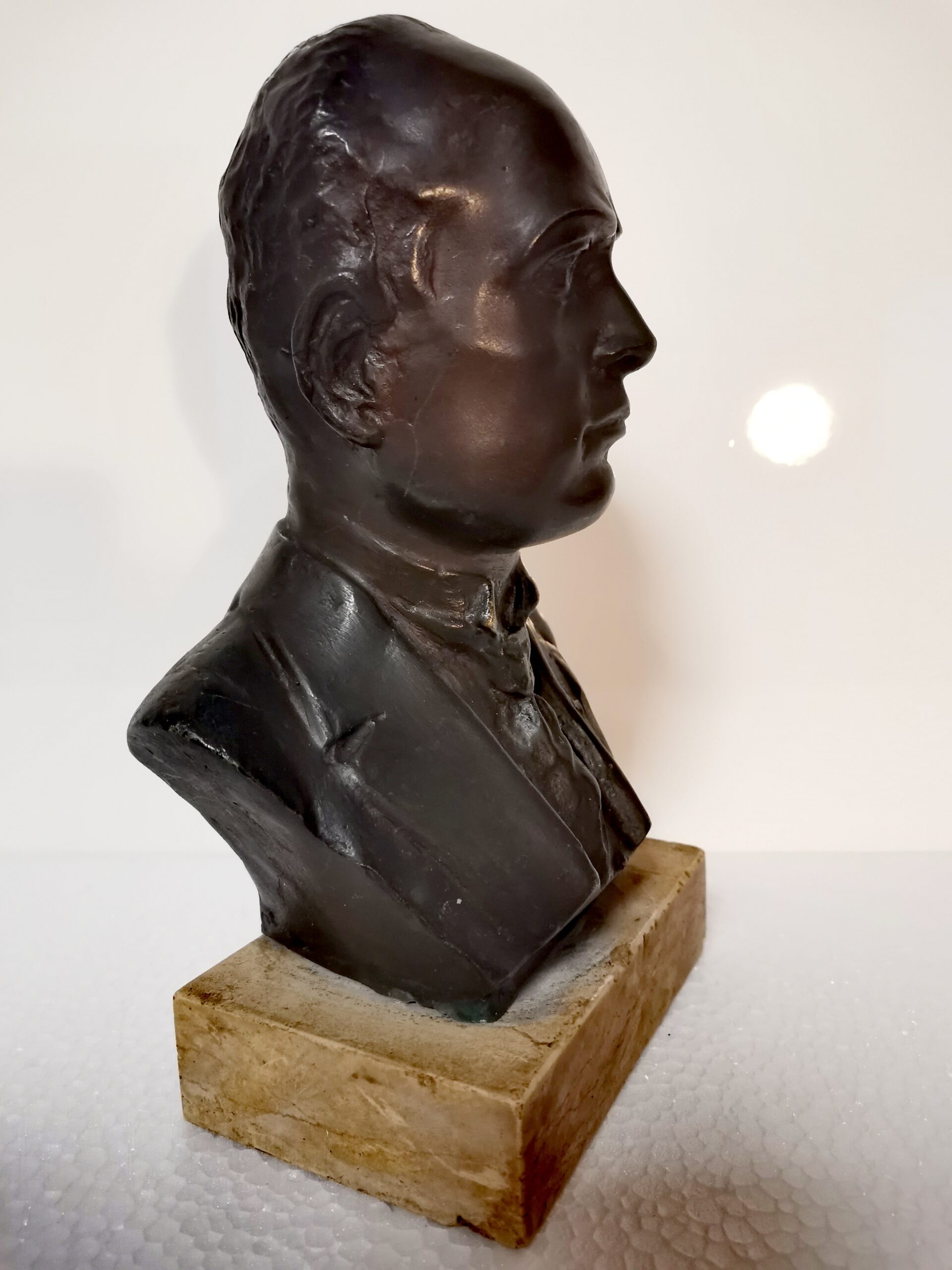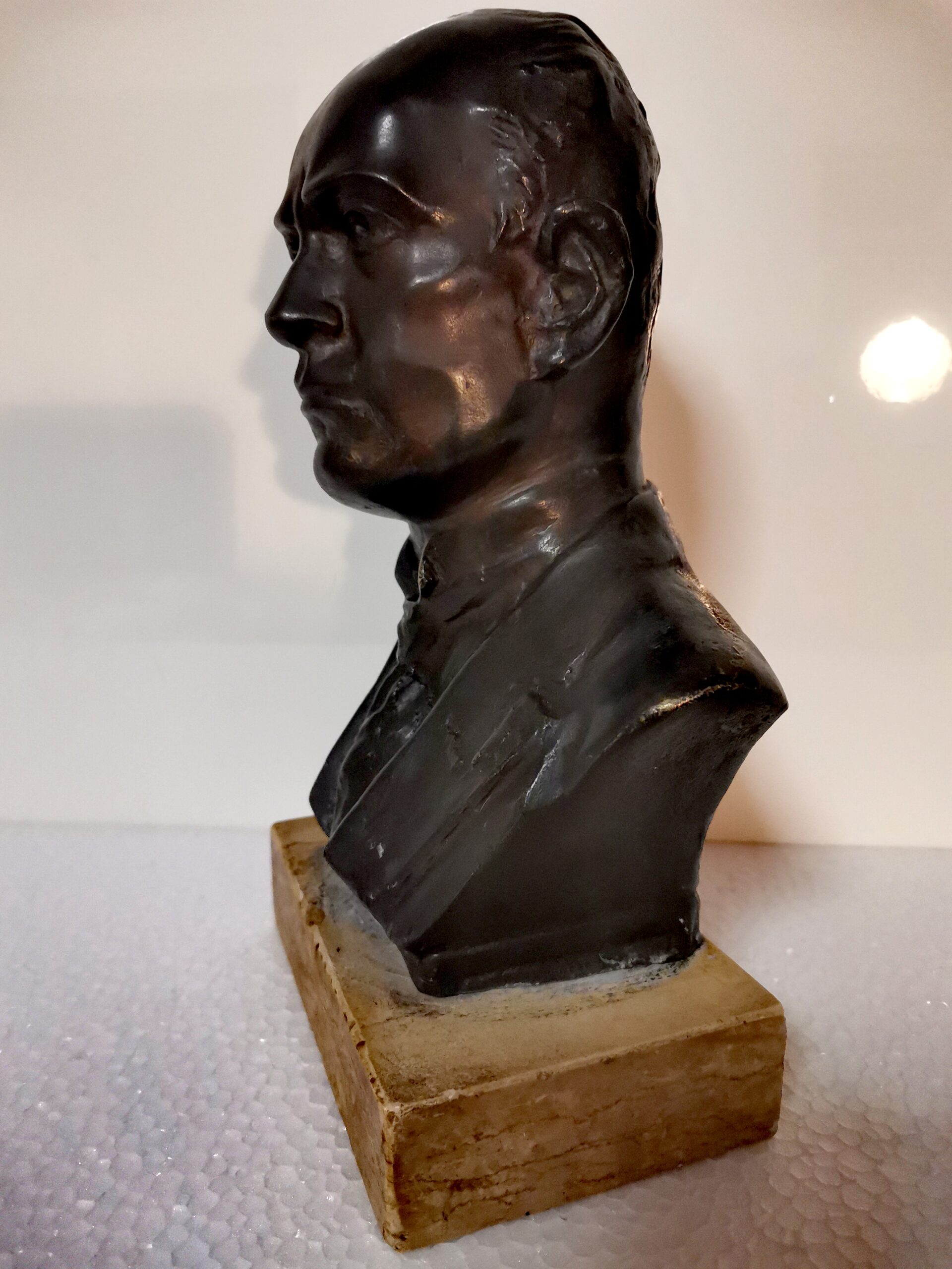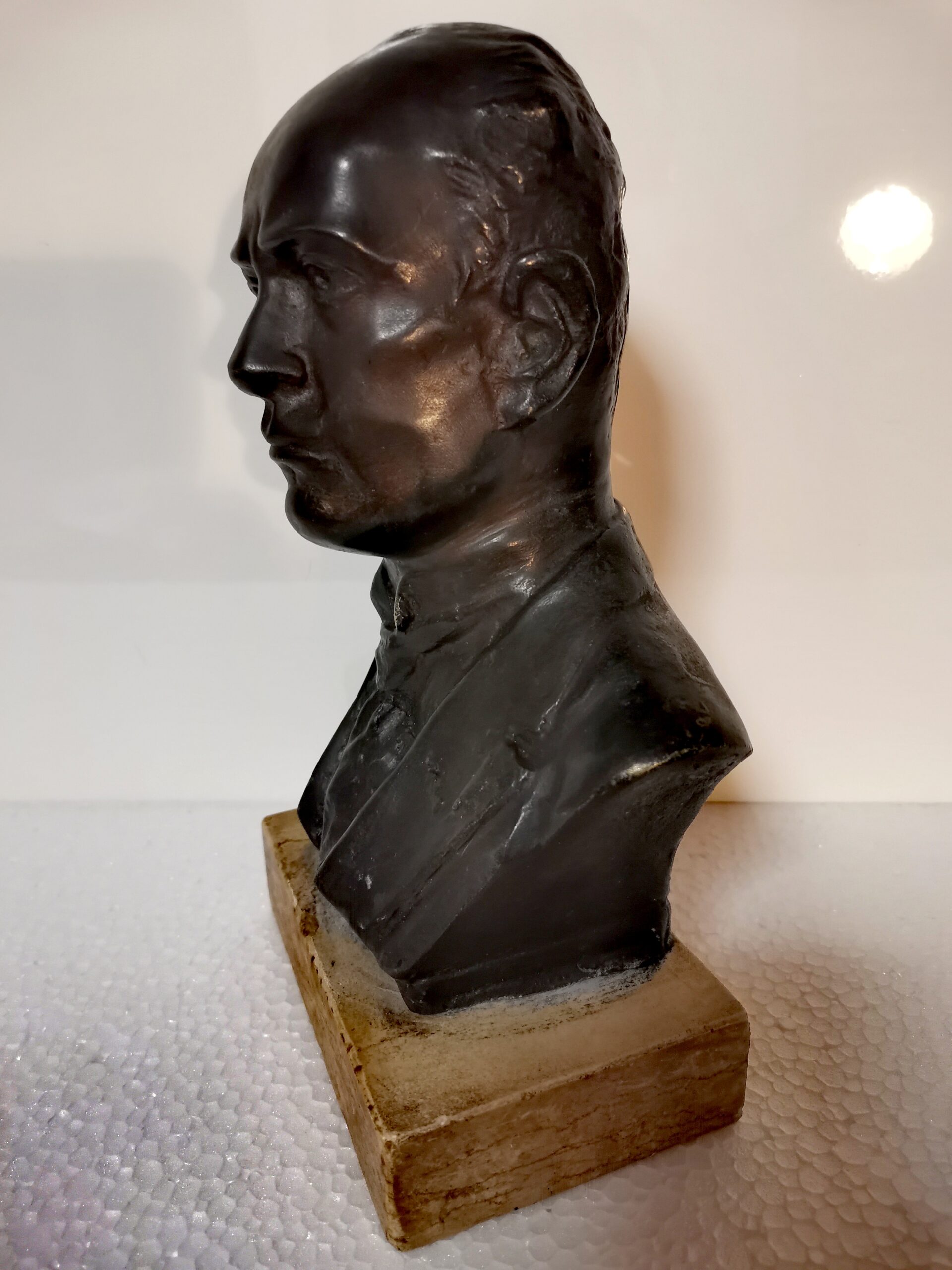 Piccolo busto in bronzo da scrivania raffigurante un giovane Duce Benito Mussolini, databile fra il 1922 e il 1928, il Duce è ancora raffiguro in abito civile come durante la marcia su Roma e sul petto porta il fascio primigenio. Altezza solo bronzo 21 cm.